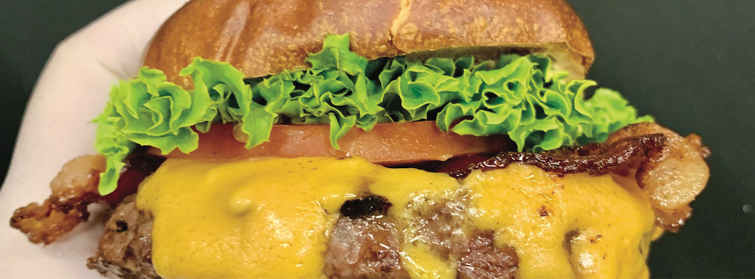 - Custom blend patty, apple wood smoked bacon, double cream brie cheese, caramelized onion, arugula and raspberry-jalapeño melba on a toasted pretzel bun
