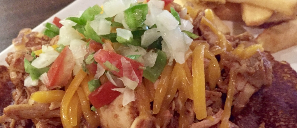 - House smoke pulled pork, cheddar cheese, green chiles, seasoned black beans and rice rolled into a cheddar-jalapeño tortilla, grilled and topped with house beerbecue sauce and pico de gallo. Served with sides of ranchero beans and plain or seasoned fries.