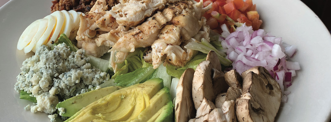 - Grilled chicken, avacado, bacon, tomato, red onion, mushroom, hard-boiled egg and crumbled bleu cheese atop a bed of chopped romaine lettuce